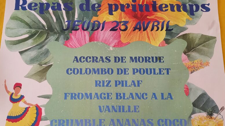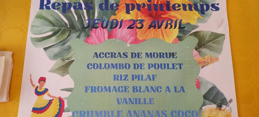 Le menu, soigneusement élaboré, a fait voyager les convives sous les tropiques. En entrée, de savoureux accras de morue, croustillants à souhait, ont éveillé les papilles. Le plat principal, un colombo de poulet parfumé, accompagné de son riz pilaf, a conquis tous les amateurs de cuisine épicée et chaleureuse. Pour terminer sur une note douce et exotique, un fromage blanc délicatement parfumé à la vanille, suivi d’un crumble ananas-coco, a ravi les plus gourmands.