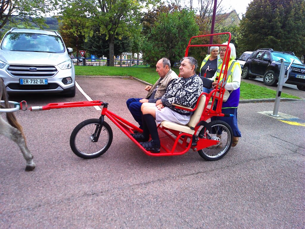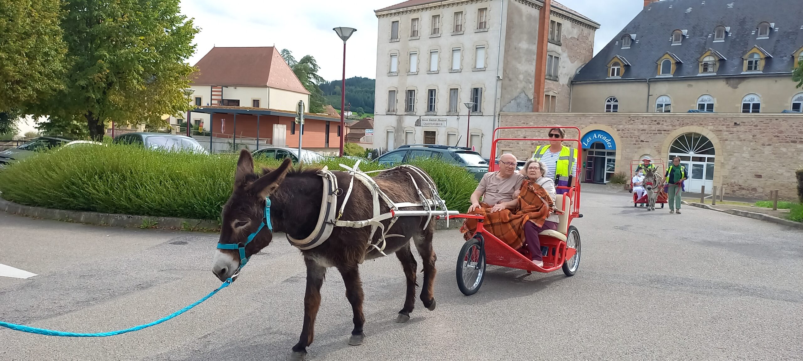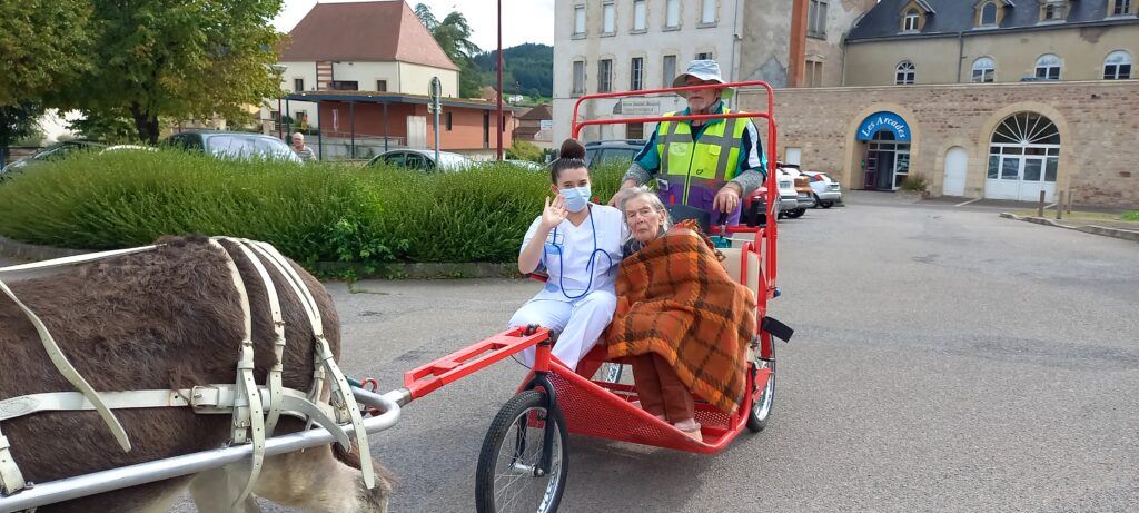 Le lundi 15 septembre à la résidence l’Oasis et le mardi 16 septembre à la résidence Ste Anne ont résonné du bruit doux des sabots et des rires des résidents. L’association Petit sabot et grandes oreilles est venue à la rencontre des aînés pour leur proposer une activité hors du commun : des promenades en calèche tirée par des ânes.