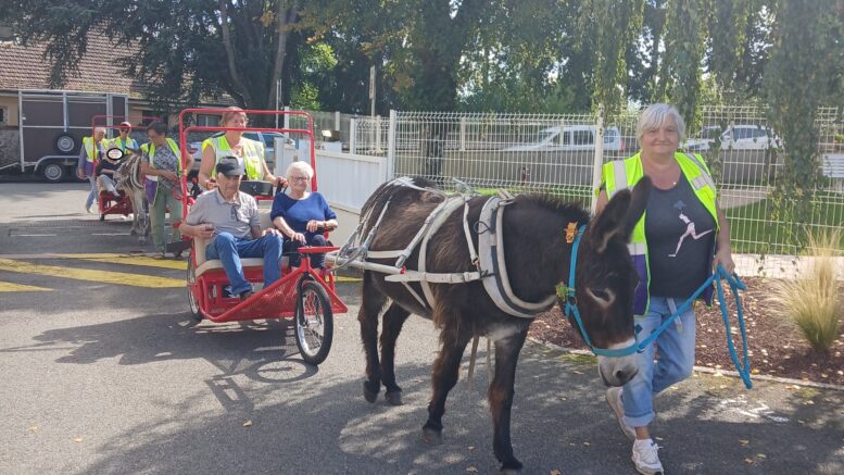 Le lundi 15 septembre à la résidence l’Oasis et le mardi 16 septembre à la résidence Ste Anne ont résonné du bruit doux des sabots et des rires des résidents. L’association Petit sabot et grandes oreilles est venue à la rencontre des aînés pour leur proposer une activité hors du commun : des promenades en calèche tirée par des ânes.
