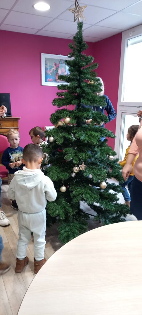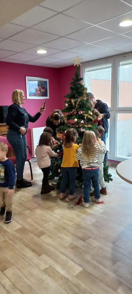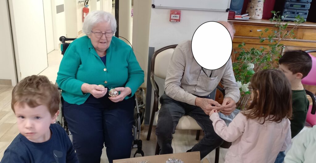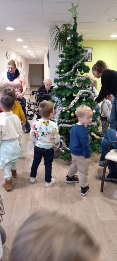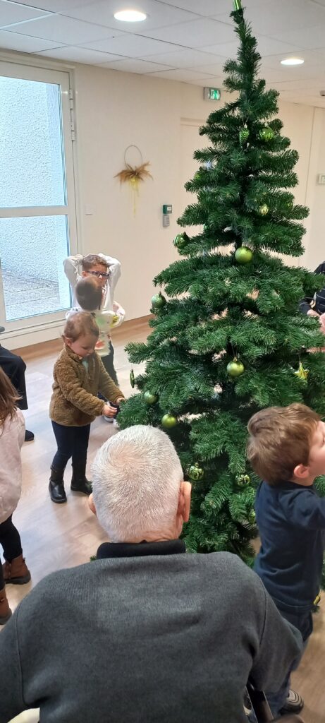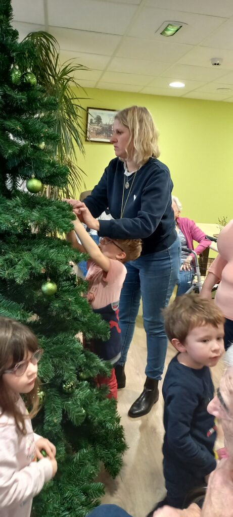 Dès leur arrivée, les enfants ont été répartis auprès des résidents afin de partager les décorations qu’ils avaient préparées. Boules, guirlandes, étoiles et créations colorées ont rapidement pris place sur les branches des sapins. L’enthousiasme des enfants et la joie des résidents ont rendu cette activité particulièrement conviviale.